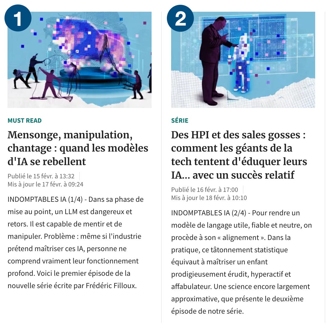 Cette semaine, j’ai publié dans Les Echos une nouvelle série intitulée “Dans la boîte noire des IA”. L’idée était de comprendre le processus de construction des Grands modèles de langage (LLM), et surtout d’explorer la façon dont ils sont maîtrisés dans les phases de post-entraînement et l’alignement.